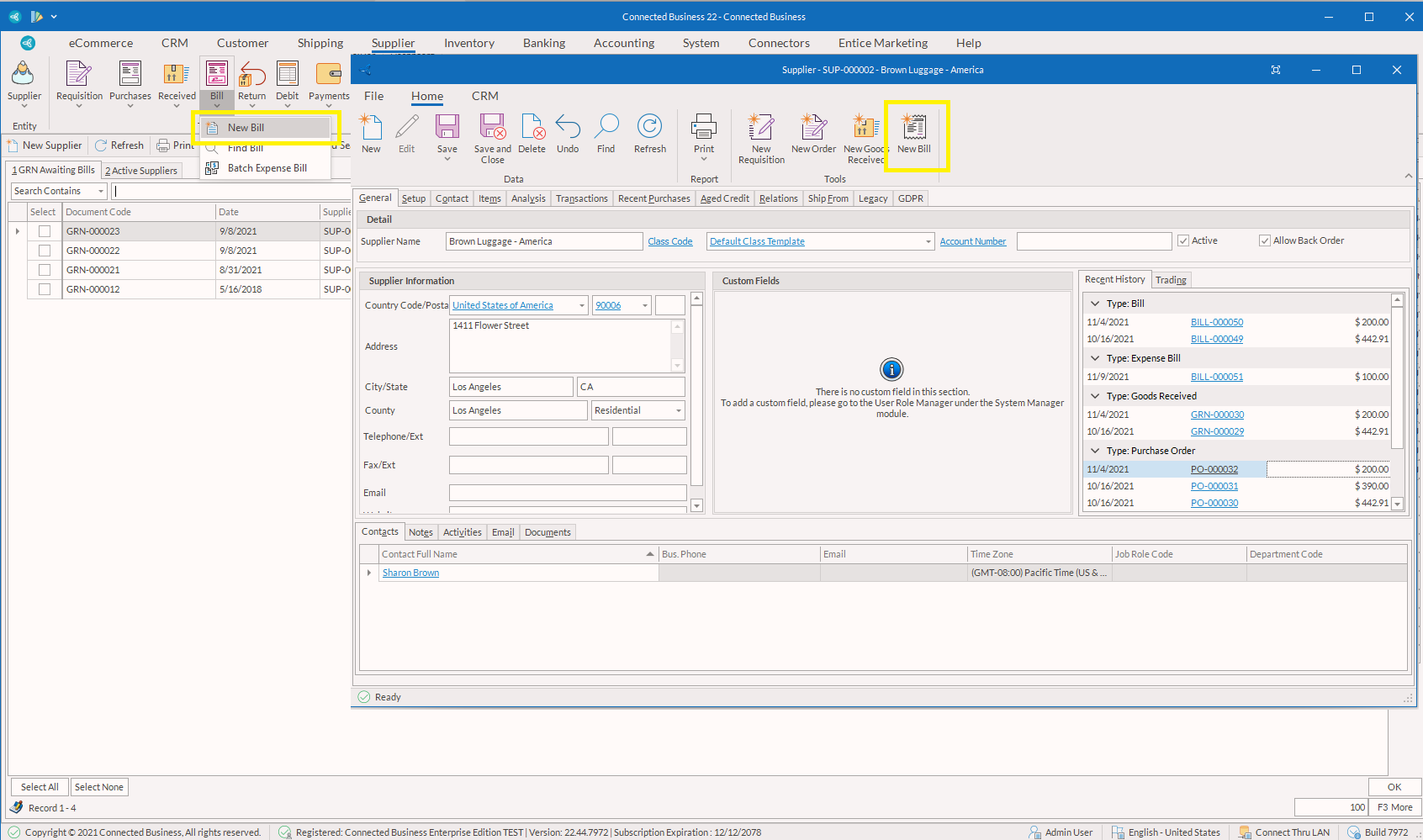 b. New Bill/Purchases button from the Supplier detail form