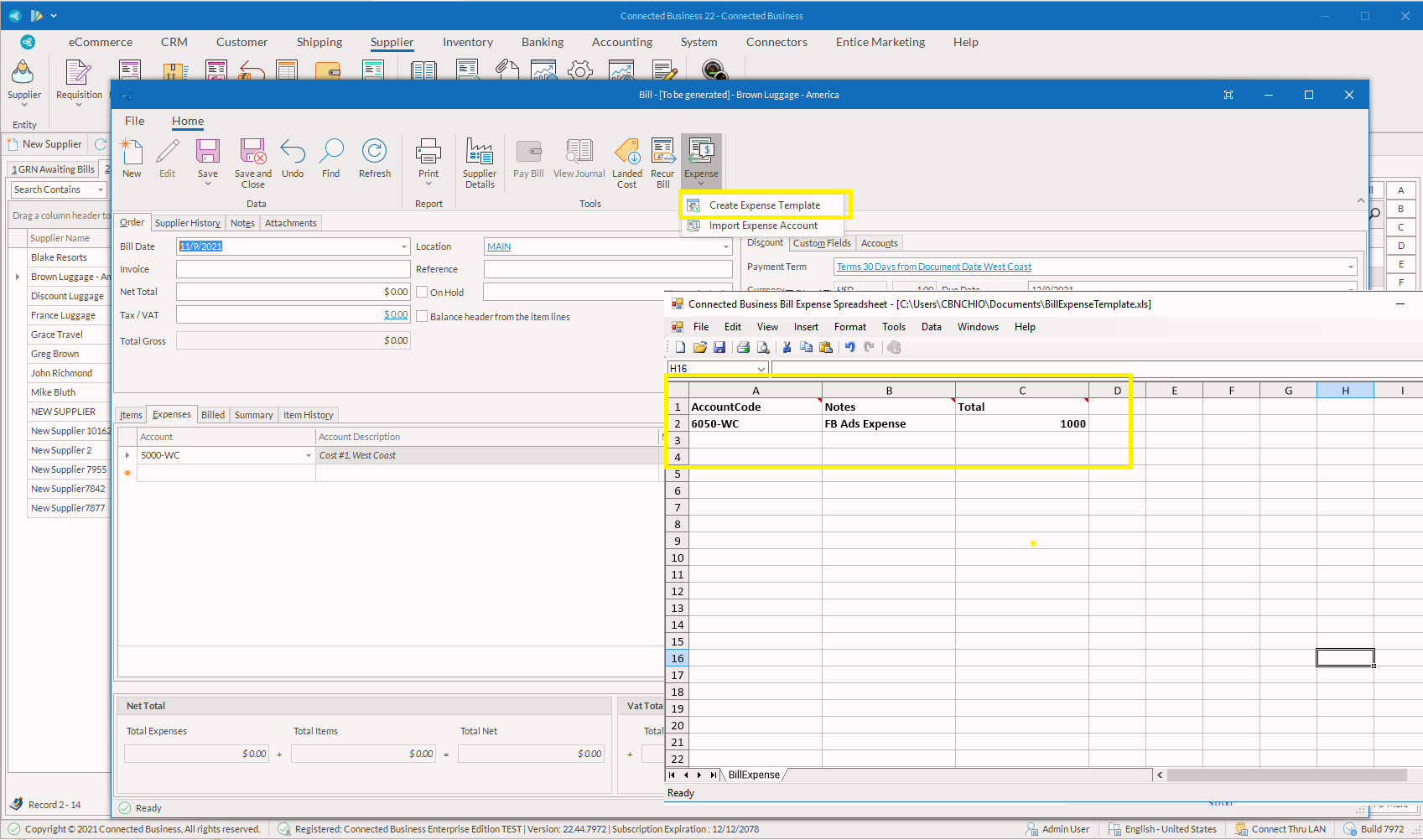 5. Click on "Import Expense Account" to import the template you just saved and the data will be transferred to the bill form (Expenses tab).