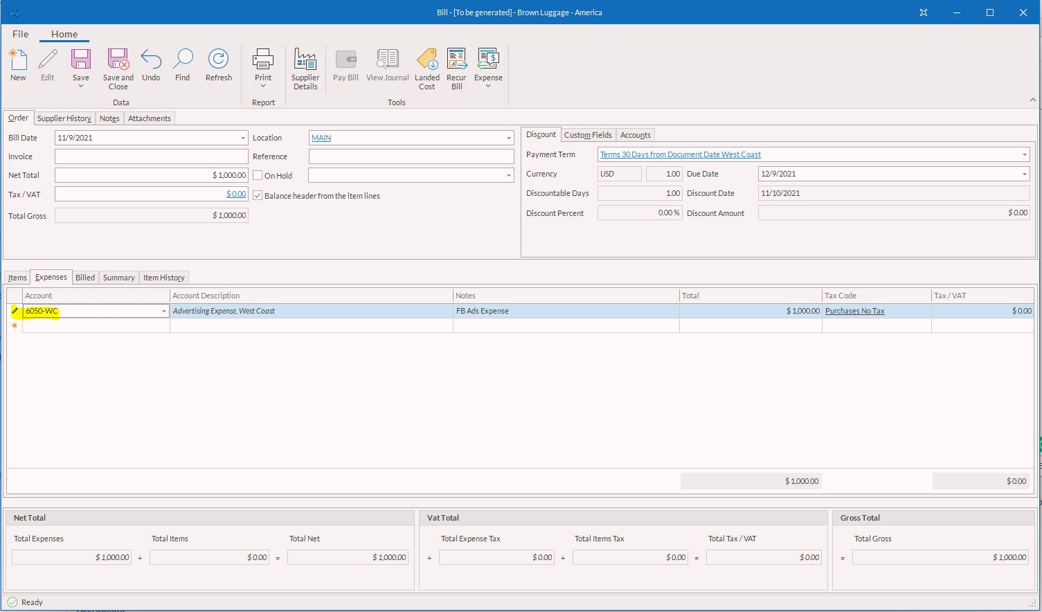6. Make sure all information is correct before you save and post the Bill.